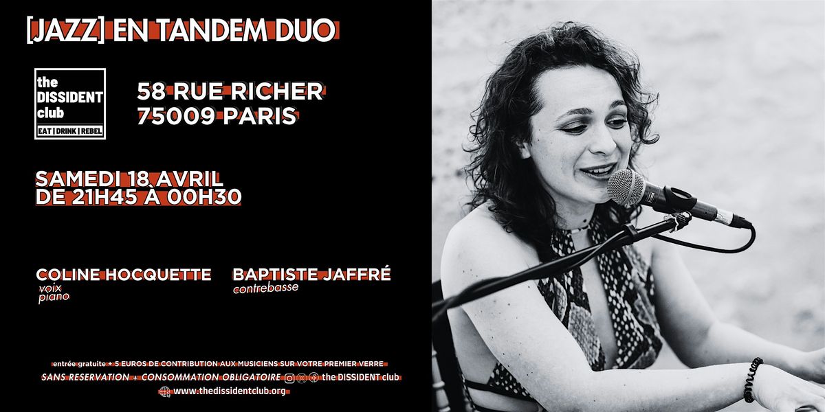 Rejoignez-nous pour un concert tout en élégance et en émotion avec Coline Hocquette (piano/voix) et Baptiste Jaffré (contrebasse). Ensemble ils redonnent vie et jouent avec les grands standards du jazz en finesse, avec complicité et swing. Une soirée chaleureuse, intime et résolument musicale à ne pas manquer!Coline Hocquette - piano/voixBaptiste Jaffré - contrebasse