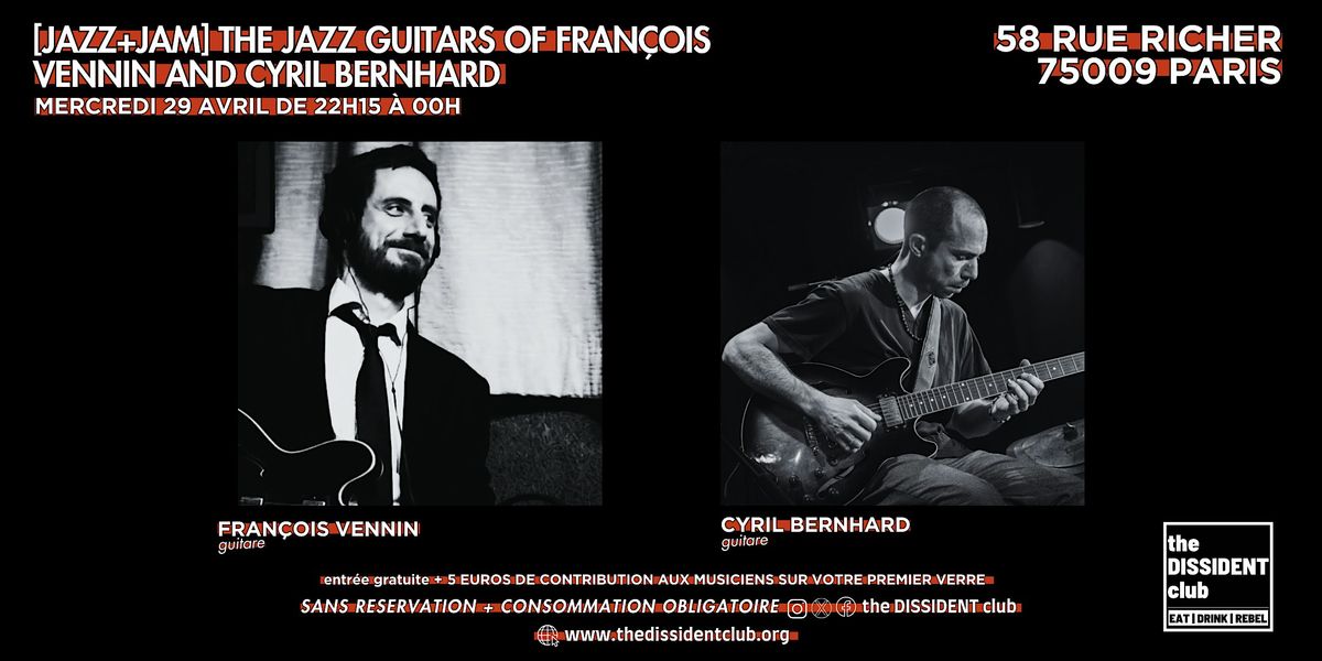 Un duo de guitares où le jazz rencontre standards, chansons et pop, dans un esprit de complicité et de liberté. Entre échanges subtils et énergie spontanée, Cyril Bernhard et François Vennin proposent un moment musical vivant, élégant et accessible, porté par deux univers qui se répondent avec finesse.