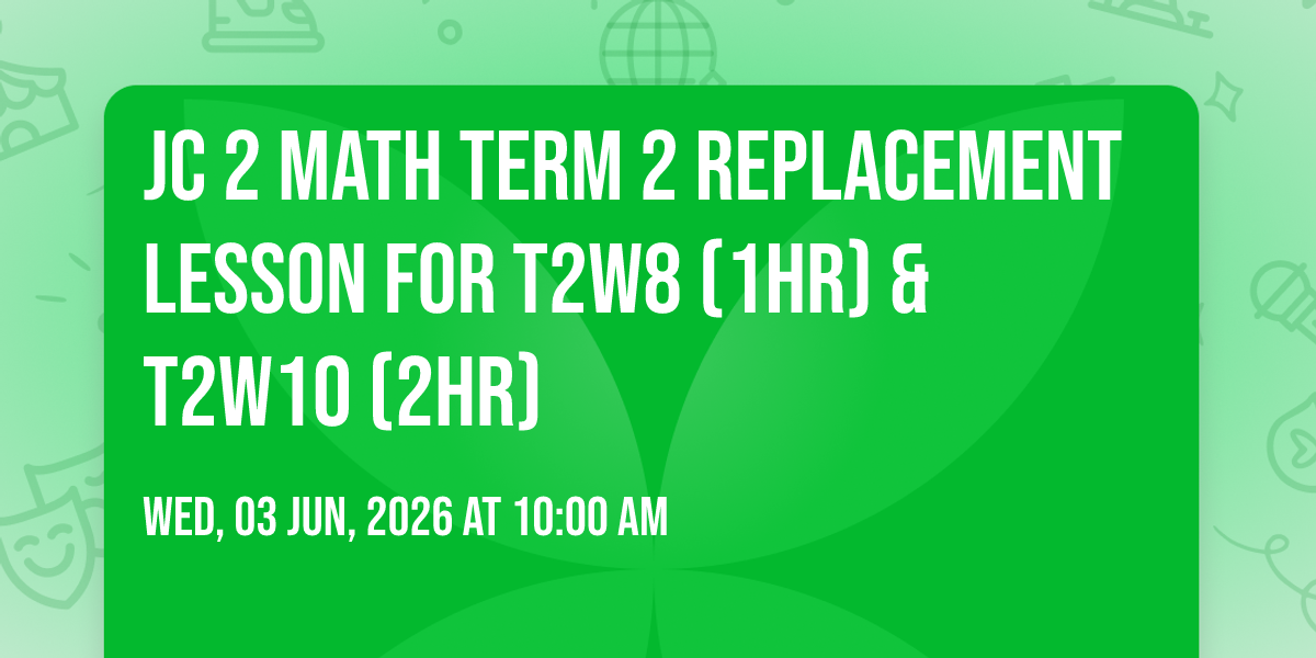 No regular lessons from 1 - 7 June (T2W8) & 15 - 21 June (T2W10)