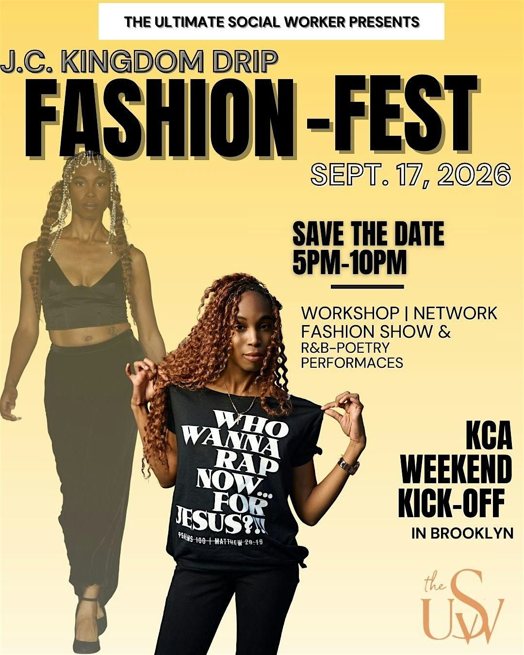 Info: Simone E aka "The Ultimate Social Worker" Author, TEDx Speaker, Model & Christian R&B Singer is the MC of the night. She will guide the crowd through the heart behind the JC Kingdom Drip vision. Simone will facilitate the showcase of 4 featured christian designers with R&B and Spoken Word Poetry performances in between the designer walks. ARTIST LINE_UP & DESIGNER LINE_UP will be revealed soon.