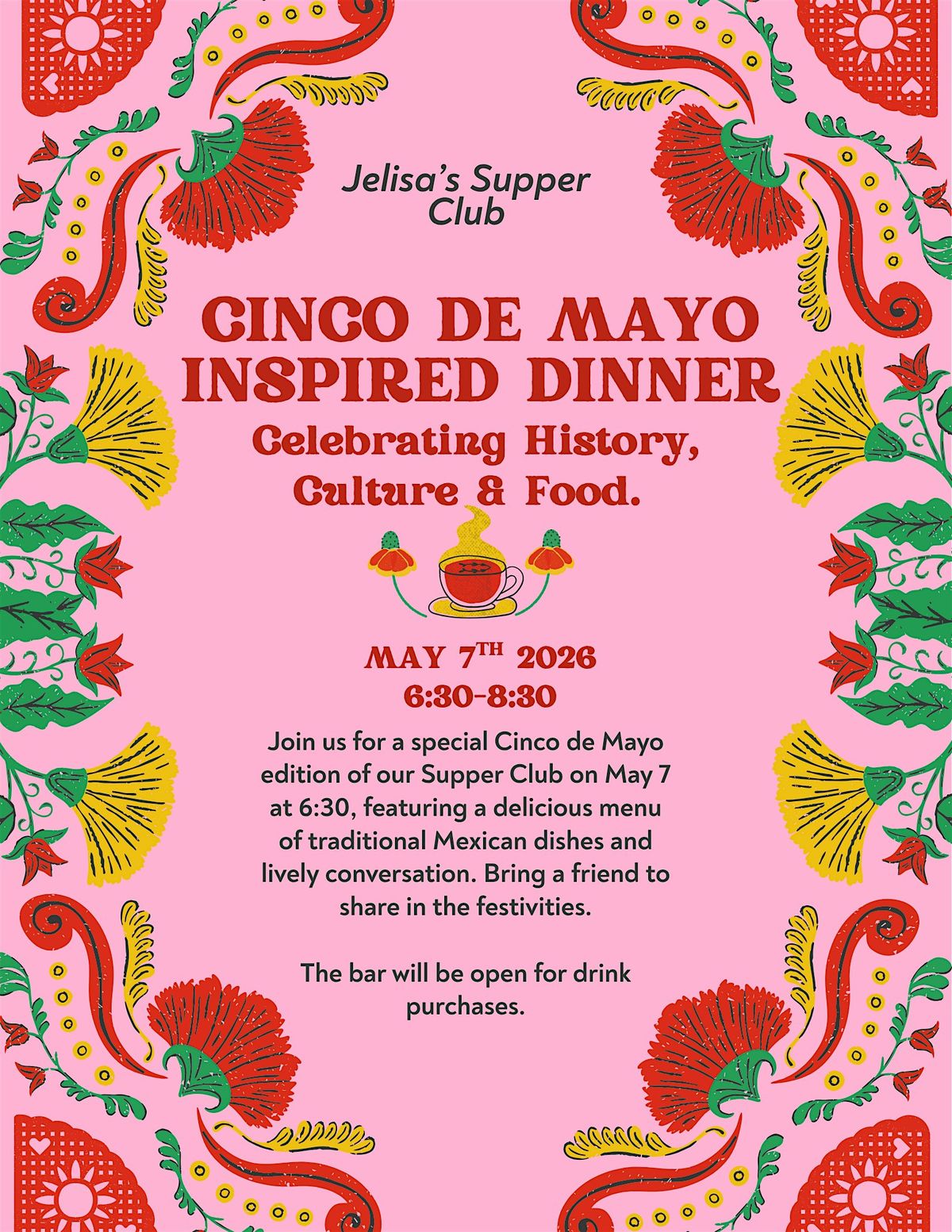 Get ready for a fun-filled evening celebrating Cinco De Mayo with Jelisa's Supper Club! Join us in person for delicious food, great vibes, and awesome company. It's the perfect chance to kick back, enjoy some tasty eats, and share good times with new friends. Don’t miss out on this fun night – come hungry and ready to have a blast! The Bar will be open for drink purchases.