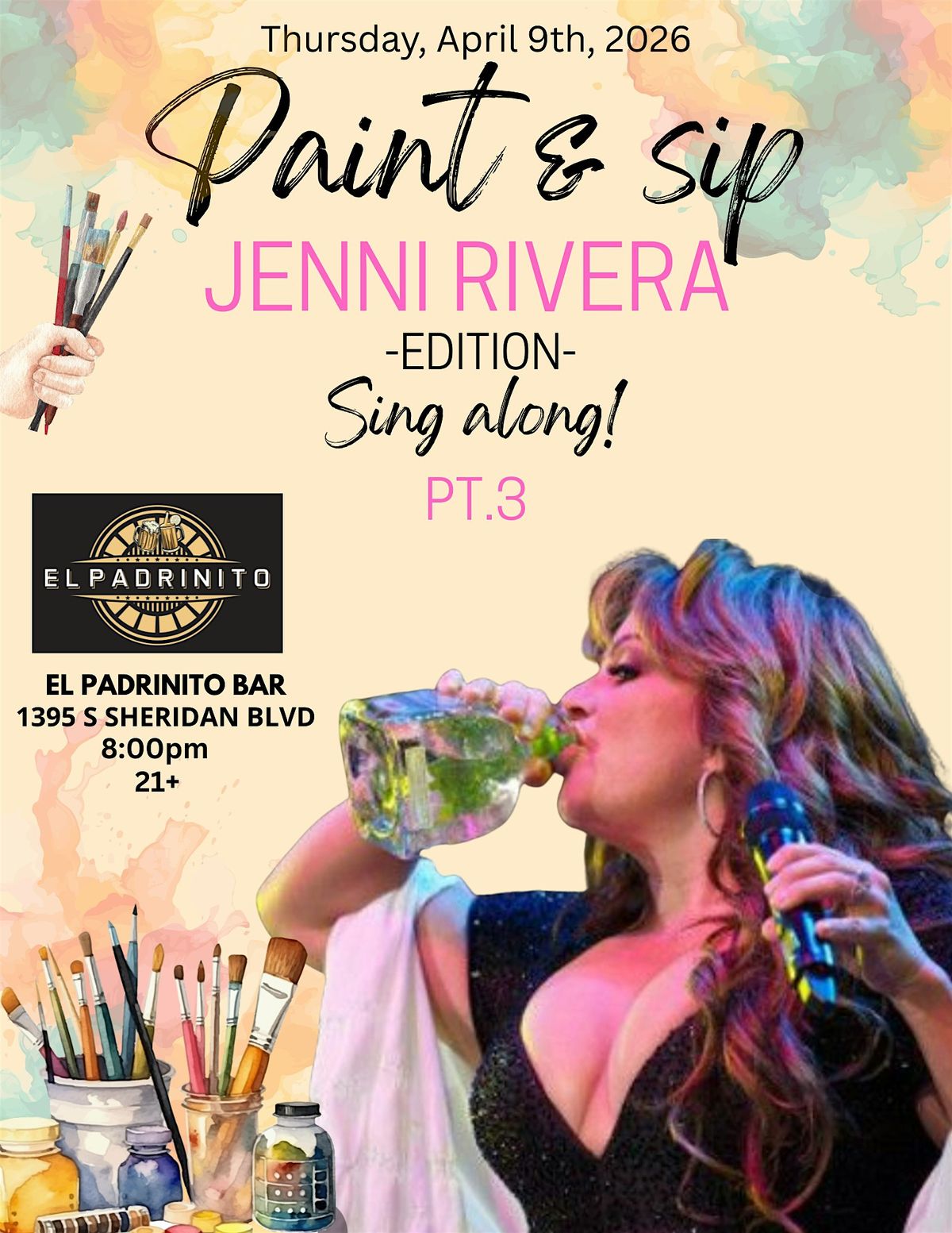 Get ready for a super fun in-person experience! Join us for the Jenni Rivera Paint N Sip Sing Along, where you'll paint, sip your favorite drink, and sing along to all the best tunes. Whether you're a fan of Jenni's music or just want a chill night with friends, this is the perfect way to unwind and get creative. Don't miss out on the good vibes and great company—come make memories with us!