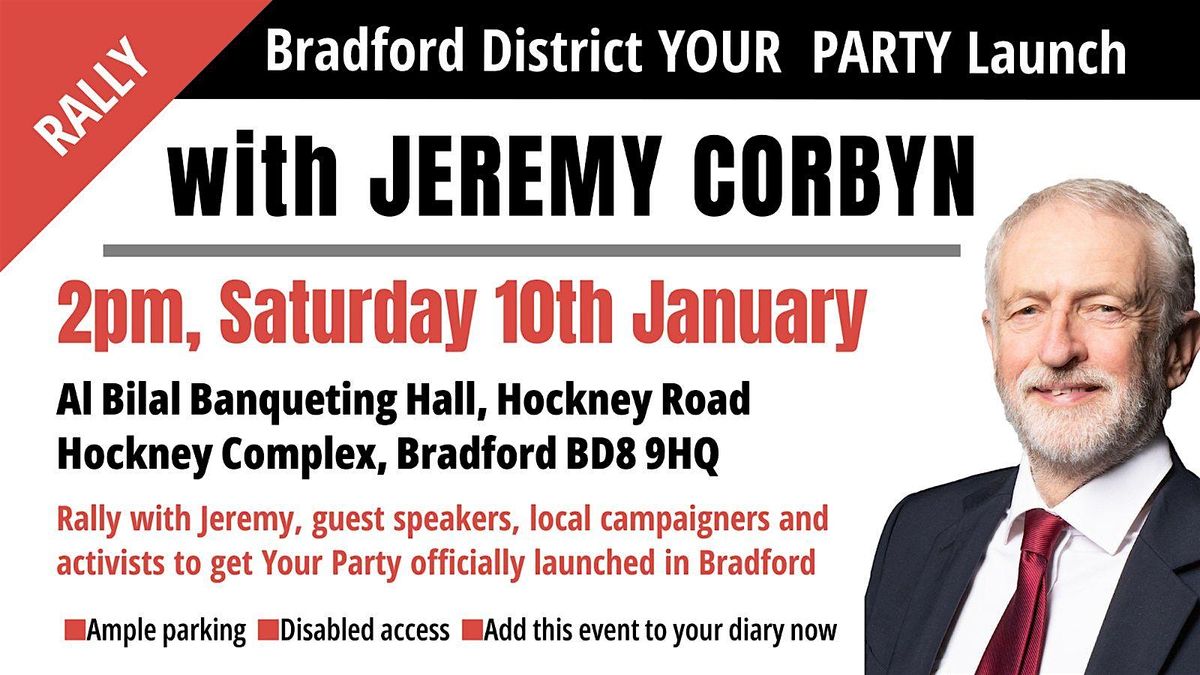Jeremy Corbyn MP will be in Bradford on 10th Jan to launch Your Party. Tickets are free so please reserve your seats now.