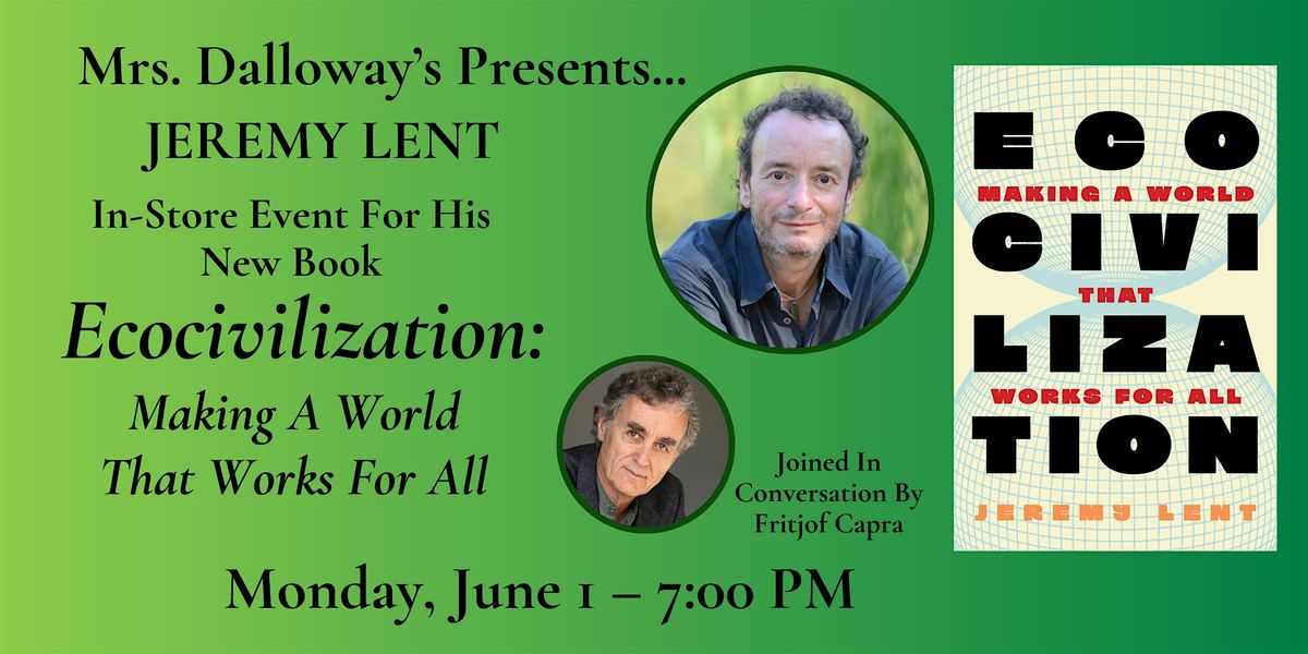 Join us at Mrs. Dalloway's Bookstore on Monday, June 1 when Jeremy Lent comes to the store to share his new book Ecocivilization: Making a World That Works for All. Jeremy will be joined in conversation by Fritjof Capra and will sign copies of his book after the presentation.