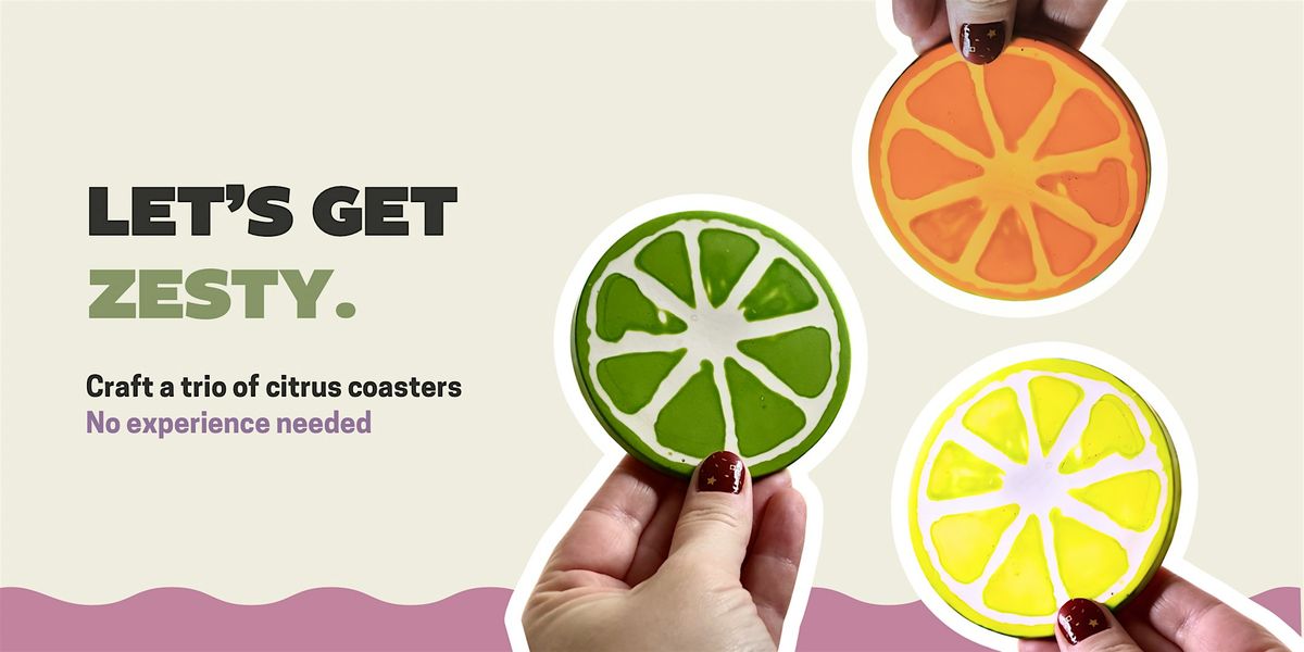 In this 2 hour workshop, you’ll make a trio of round citrus fruit inspired coasters. We’ll mix up lime green, lemon yellow, and juicy orange before hand-painting the segments and rinds. Then we’ll pour the rest of the mould to get a set of bright, fun coasters you can display or use at home!