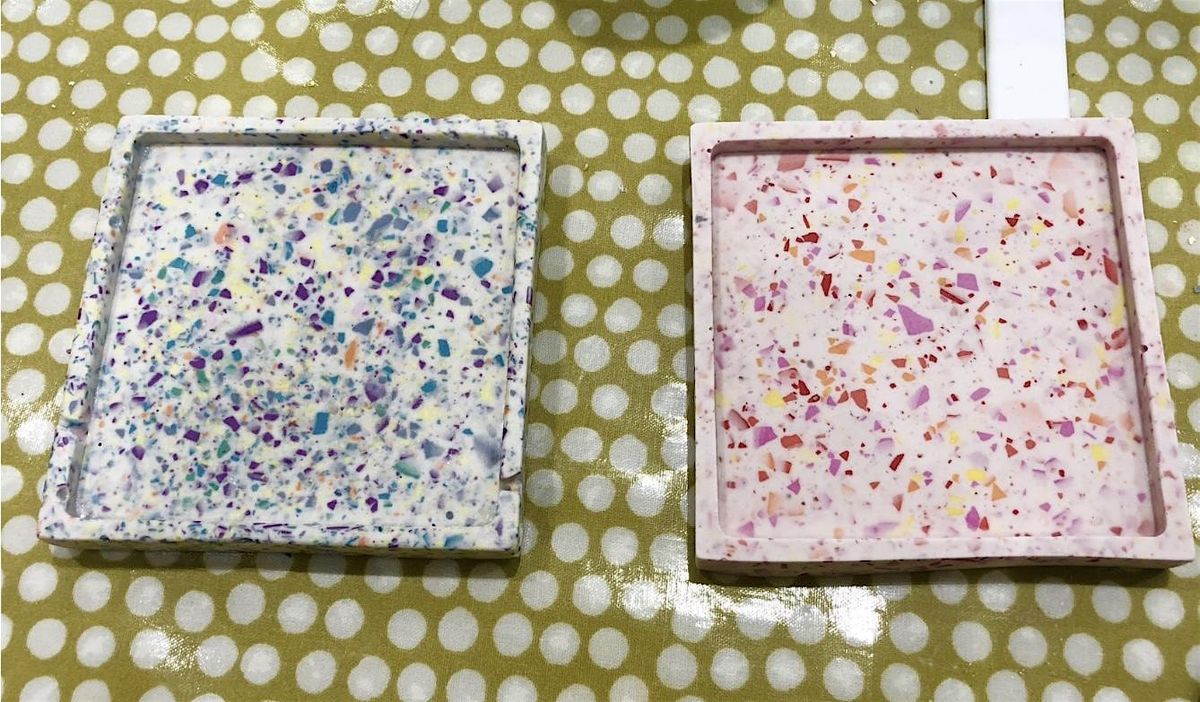 Create your own on trend terrazzo coasters using jesmonite and your choice of colours. We'll go through how to make your own terrazzo chips, how to use recycled ones and how to mix and pour jesmonite perfectly. We'll cover how to sand and seal them too so they go away shining. You'll leave with a few finished coasters and the option to make some small pots too.