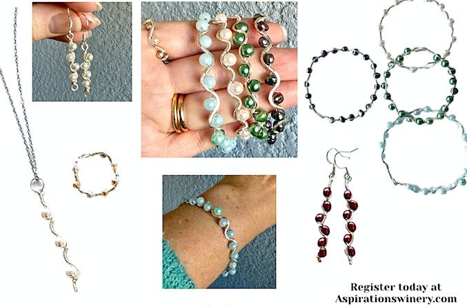 Join us at Aspirations Winery for a creative, hands-on jewelry making class. This month, you will learn the art of creating a beautiful ocean wave bracelet and pair of drop earrings with pearl accents, sized just for your wrist or desired earring length. Whether you are a beginner or a seasoned crafter, this workshop offers a relaxed environment to unwind and get creative.