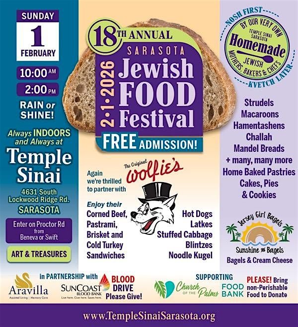 Enjoy classic Jewish nosh at Temple Sinai’s 18th Annual Jewish Food Festival. Featuring corned beef, pastrami, brisket, and turkey sandwiches in partnership with Wolfie’s Deli, along with blintzes, stuffed cabbage, and latkes. Also on offer, Jersey Girl bagels with schmears, and an expansive selection of homemade baked goods; hamantaschen, mandel bread, challah, cookies and cakes.