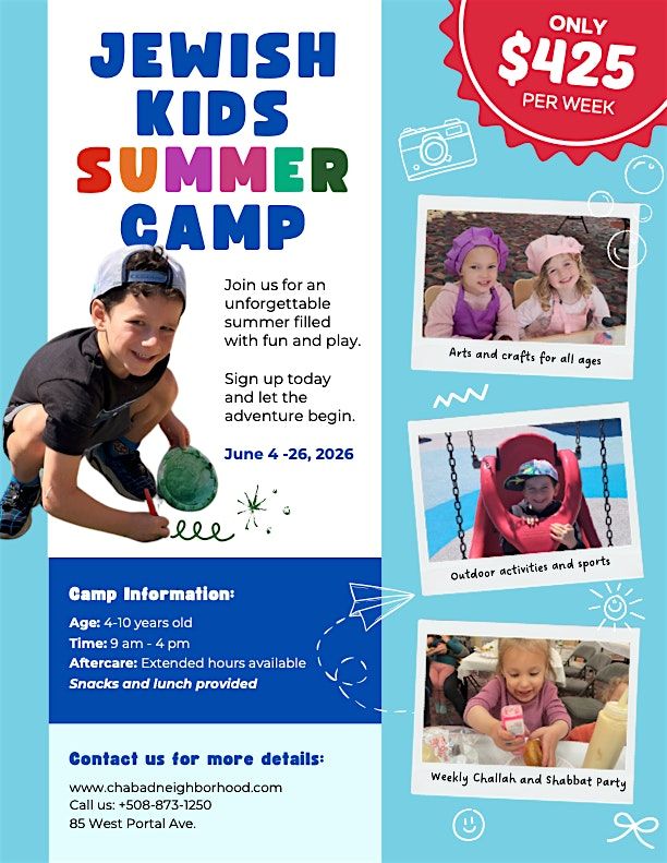 Get ready for an amazing summer at Jewisk Kids Summer Camp! This in-person camp is packed with fun activities, new friends, and exciting adventures. Whether your kid loves arts, games, or exploring, there's something awesome waiting. Don't miss out on a summer full of laughs and unforgettable memories!