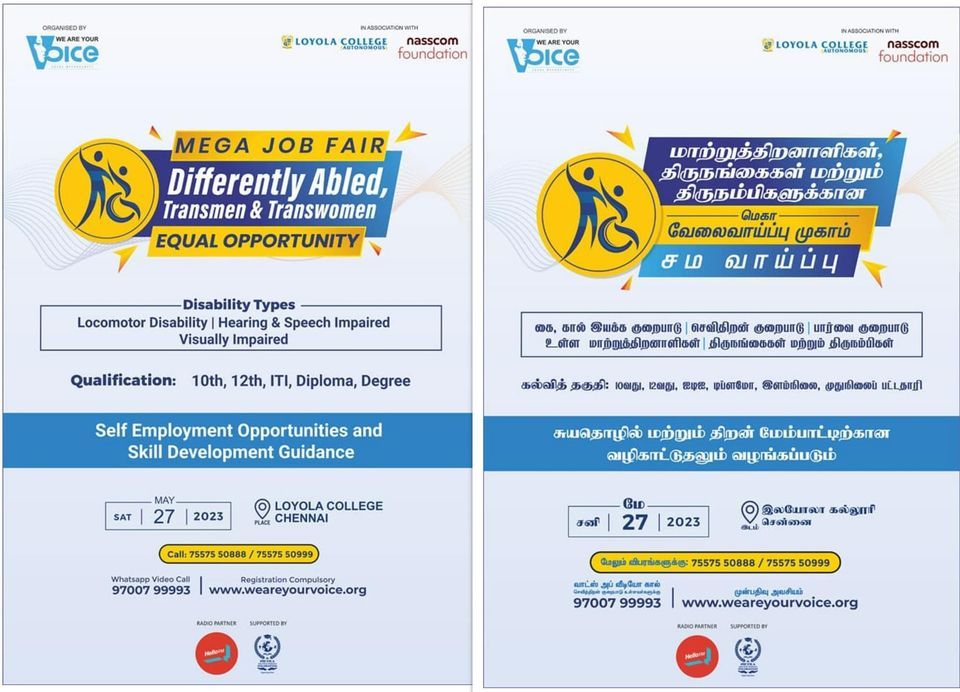 Follow Namma Chennai Ads page for more updates.We Are Your Voice is conducting Mega Job Fair for Differently Abled and Transpersons at Loyola College, Chennai on 27 May 2023.