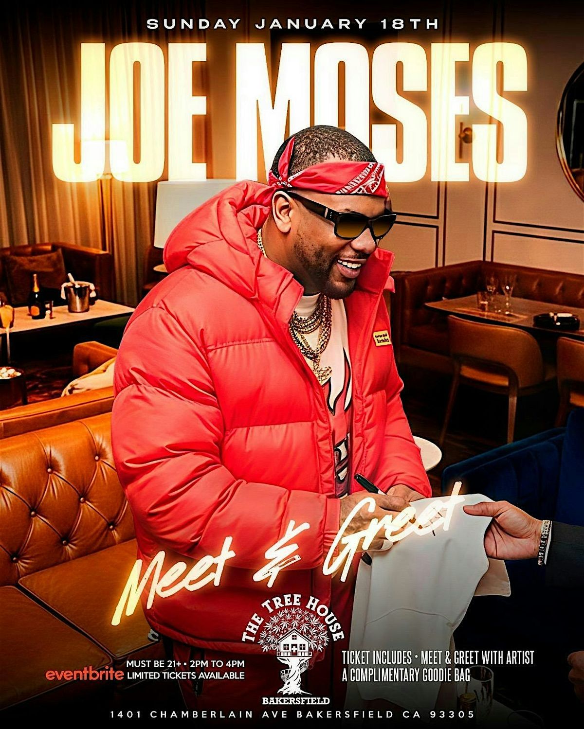 Joe moses the rapper out of los angeles california will be in bakersfield on sunday january 18th 2026. He will be doing a full meet and greet at The tree house of bakersfield (dispensary) this event is 21+ and the ticket comes with a goodiebag of thc product.