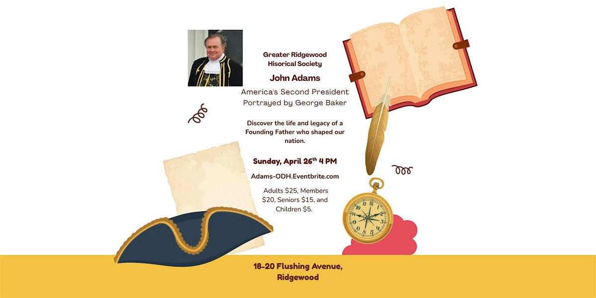 Join the Society for an evening with John Adams, portrayed by George Baker. He will present his views of the nation, history and family life in a humorous and inspiring speech. He will be dressed in the clothes he would have worn as the Second President of the United States. Adults $25, Members $20, Seniors $15, and Children $5.