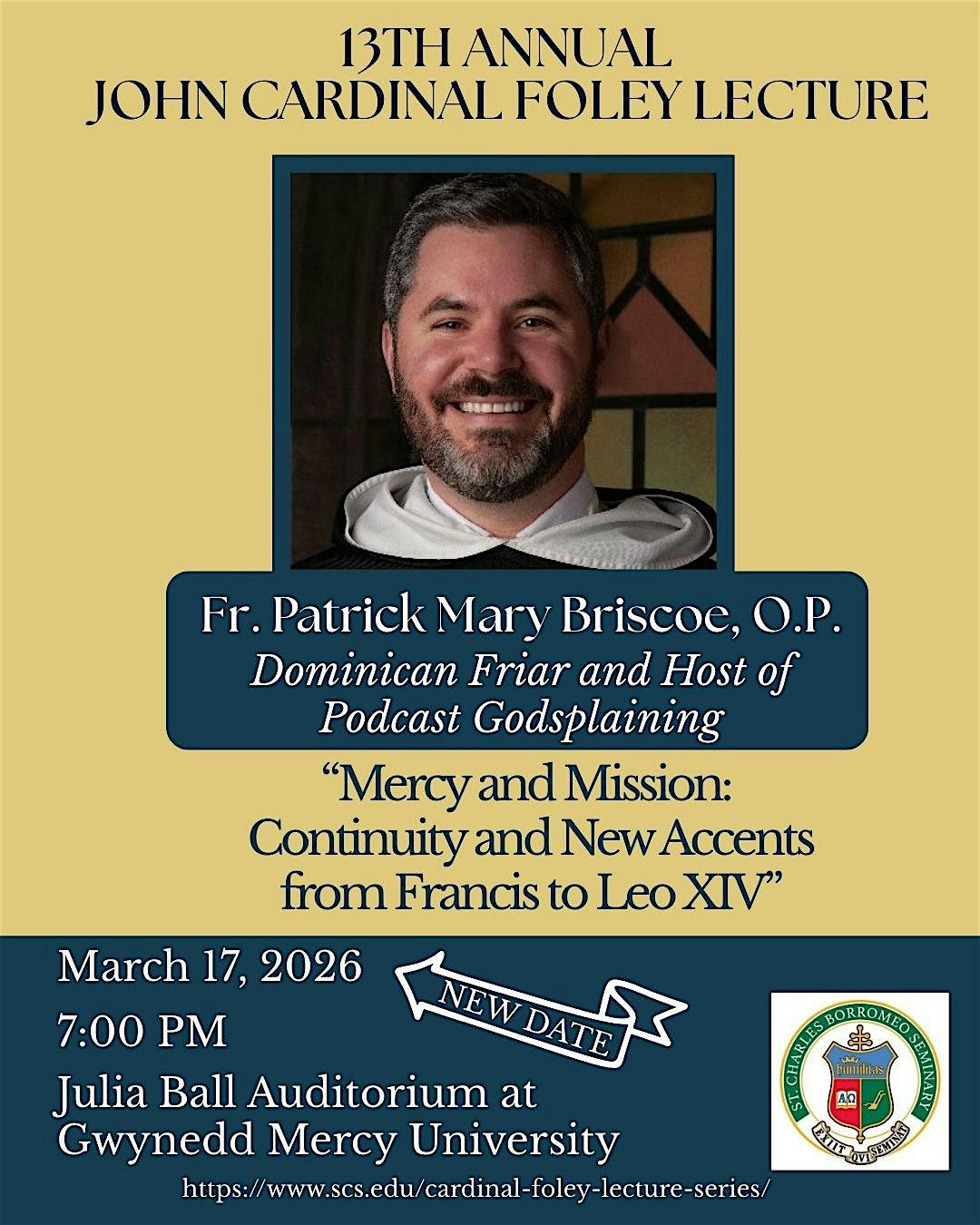 Don’t miss the 13th Annual John Cardinal Foley Lecture with Fr. Patrick Mary Briscoe, O.P.—a Dominican friar, host of the Godsplaining podcast, author, and global Catholic communicator known for his joyful, accessible preaching. As the Promoter General for Social Communication for the worldwide Dominican Order, he brings a unique perspective on faith, media, and the modern Church. He will present “Mercy and Mission: Continuity and New Accents from Francis to Leo XIV.” Join us at the Julia Ball Auditorium at Gwynedd Mercy University. Free and open to all at 7pm!