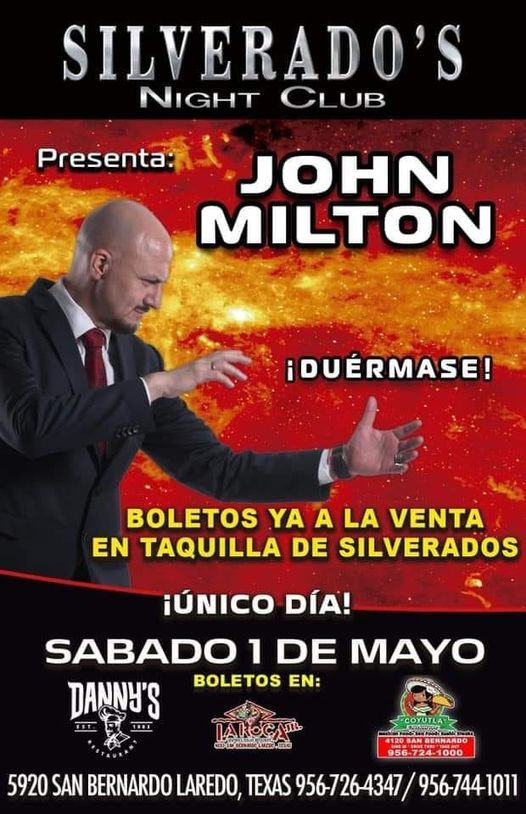 Llega al Silverados Night Club el hipnotista *John Milton* este proximo Sabado 1 de Mayo.Boletos a la venta en Dannys, La Roca , Coyutla y en taquillas del lugar en 5920 San Bernardo o para mas informacion al telefono 956-726-4347.