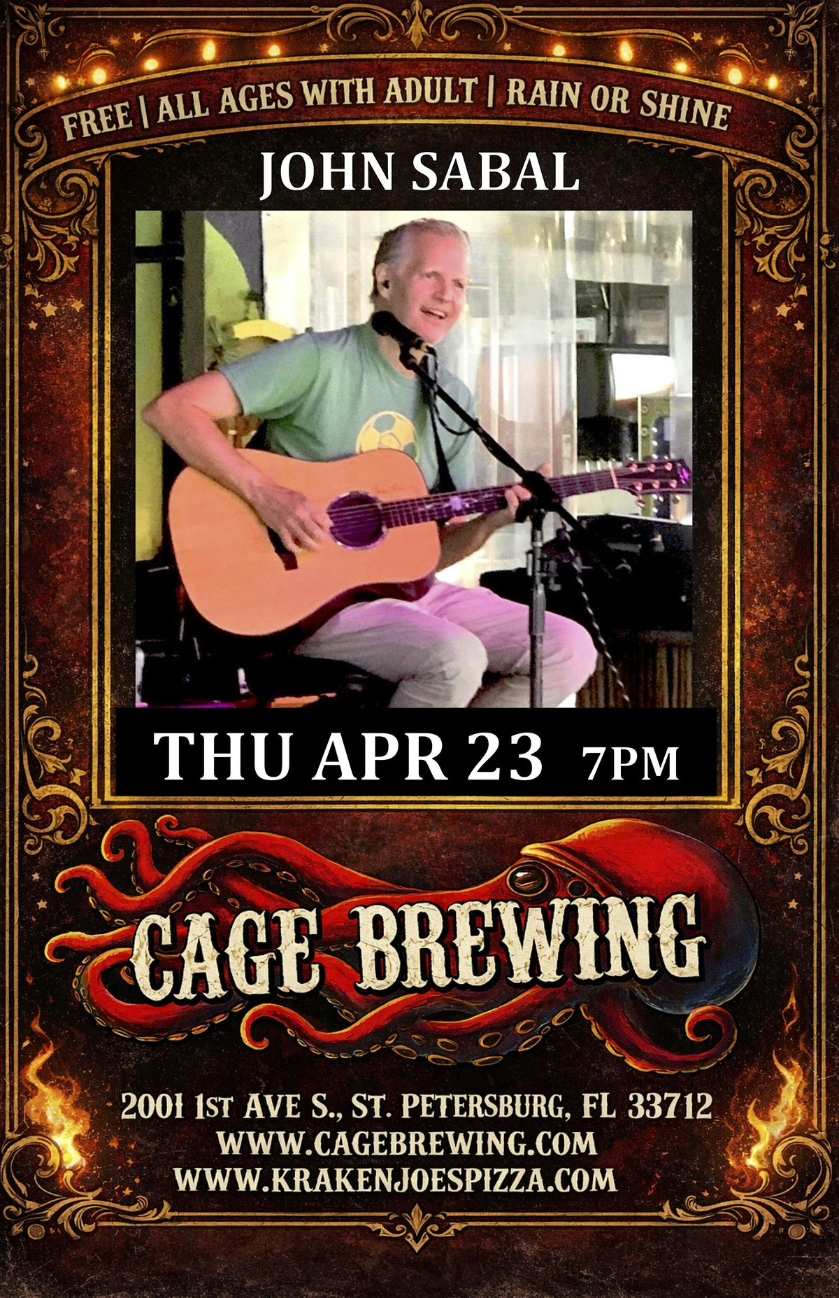Join us for an awesome night at Cage Brewing in St. Pete! Come hang out in person at Cage Brewing and experience the vibes of an unpredictable set list filled with songs you know and some you may not, all performed at the highest level with John Sabal. It's a fun chance to catch some great tunes and enjoy a cool atmosphere.