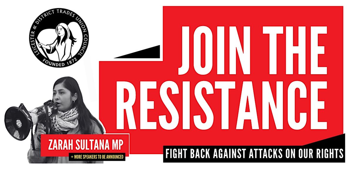 Leicester & District Trades Union Council is delighted to welcome Your party MP, Zarah Sultana, to our public meeting, addressing the international resistance against the capitalist offensive around our rights to protest, to organise and to resist.