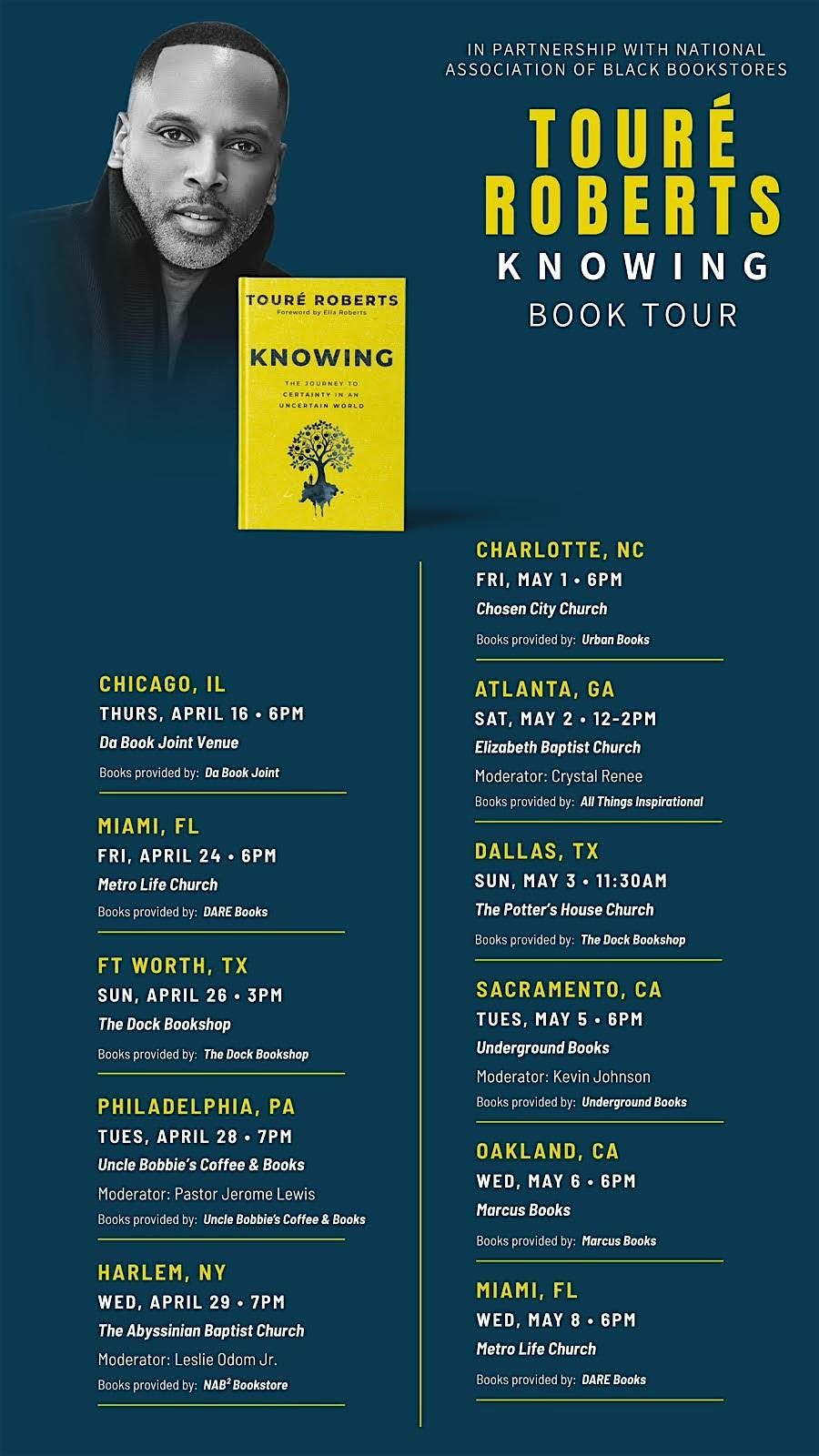 Don't miss out on the Knowing Book Tour happening at the Chosen City Church on May 1, 2026, at 6:00 PM (Eastern Time). Come hang out, get inspired, and connect with Touré Roberts in person. It's going to be a great evening filled with powerful moments and good vibes. Make sure to mark your calendar and bring your friends!