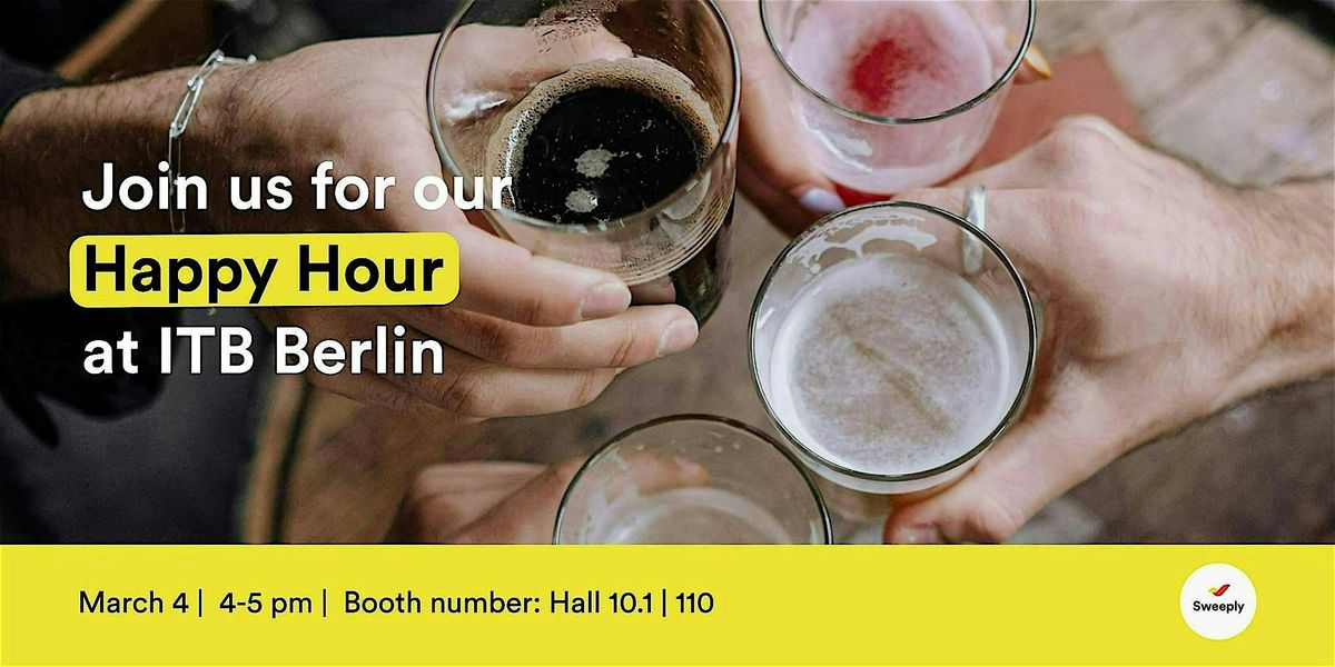 Exclusive Happy Hour at the Sweeply stand during ITB Berlin on March 4 (Day 2, Wednesday) from 4:00–5:00 PM at Hall 10.1, Stand 101.
