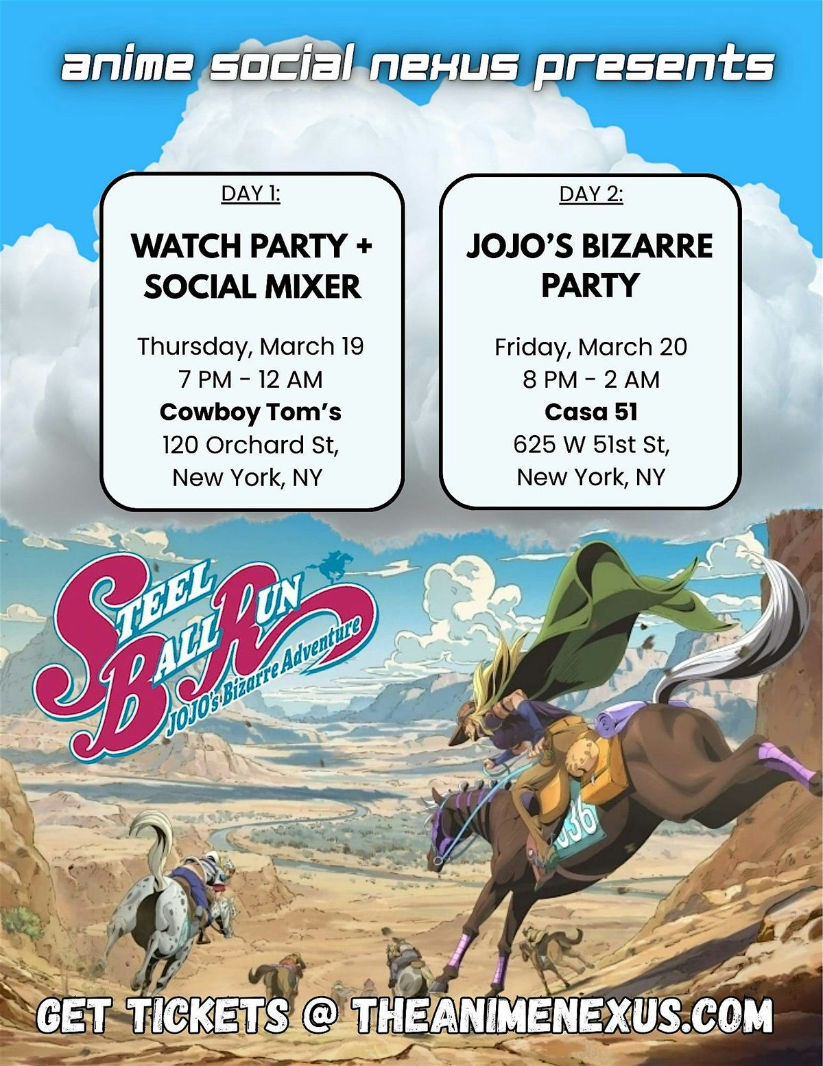 Come join us to watch the premiere of JoJo's Bizarre Adventure: Steel Ball Run with a group at Cowboy Tom's in NYC!
