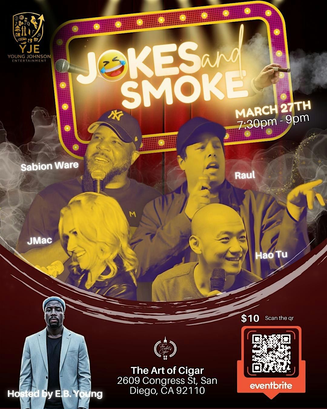 Smokes & Jokes: A cool night of cigars, and big laughs at The Art of Cigar. March 27, 7:30–9 PM. Hosted by E.B. Young. $10 tickets