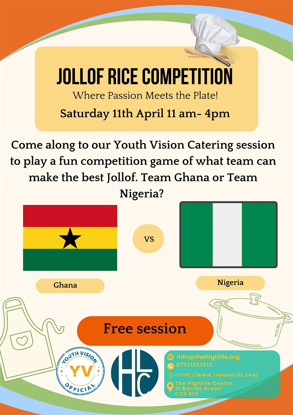 Get ready for a fun and delicious Jollof Rice Competition brought to you by Coventry Youth Vision! Join us in person to taste, judge, and celebrate the best homemade jollof rice around. Whether you're a cooking pro or just love good food, this event is perfect for foodies and community lovers alike. Don’t miss out on the fun vibes, great people, and awesome dishes. Come hungry, leave happy!