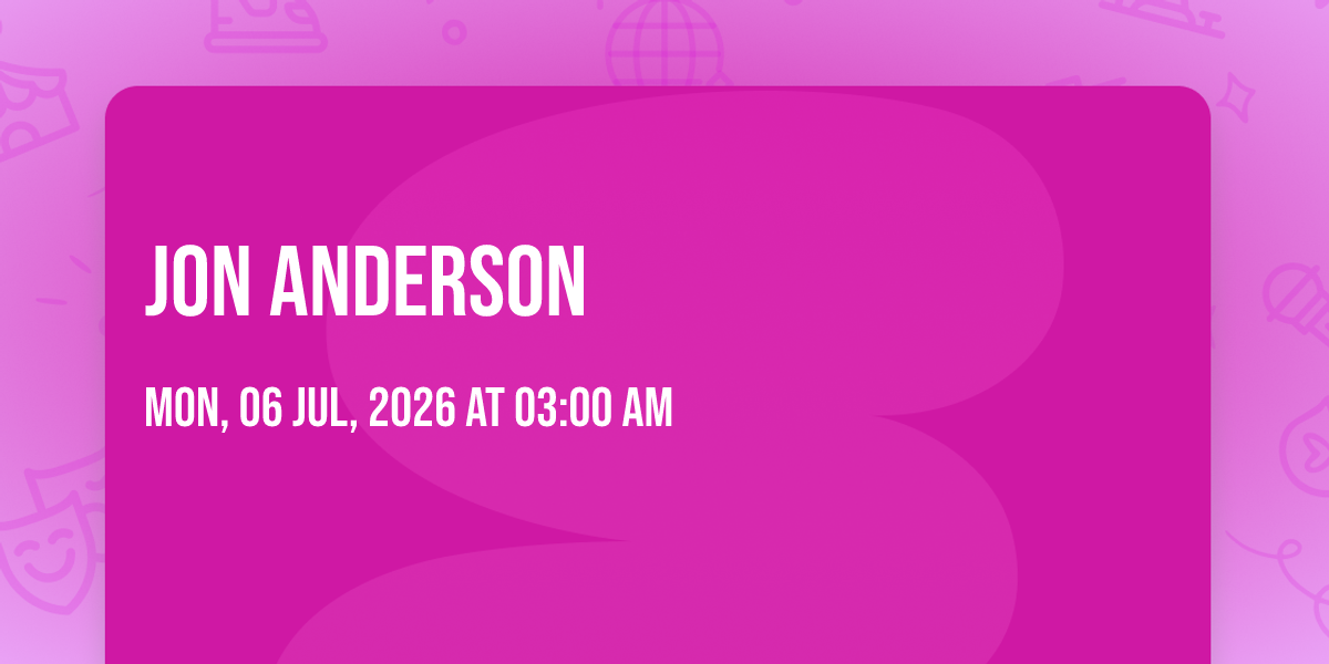 📍 Location: 38.24745, -122.272835✨ Experience the magic of Jon Anderson, where moments become memories that last a lifetime! 🏛️ The iconic Blue Note Napa at Meritage Resort in Napa, CA sets the perfect stage for an unforgettable celebration on July 6th, 2026 at 03:00 AM. 🌟 It's been a curated experience that brings together the best of entertainment and innovation, creating an atmosphere of wonder and excitement. From the moment you arrive, you'll be immersed in a world where the ordinary transforms into the extraordinary. 🎊 Book early to secure your place in what promises to be an event that will be talked about for years to come!