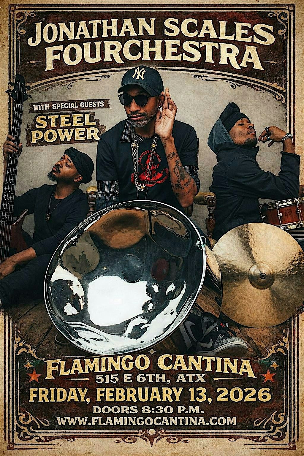 Join us at Flamingo Cantina for Jonathan Scales Fourchestra + Steel Power on Friday, February 13thYou’ve heard this before, but the whimsically named Jonathan Scales Fourchestra is really tough to describe. Veering from in-your-face, jaw dropping chops and passion, to those quiet moments when the background noise disappears and you hold your breath to take in a soundscape of solitude, the power trio of electric bass (E'Lon JD), drums (Maison Guidry), and steel pans (Jonathan Scales) combines elements of jazz, classical, and progressive rock, peppered with Latin rhythms and soulful outbursts of funk. From club and festival stages across North America and Europe, and tours of Africa, Southeast and Central Asia as a Cultural Ambassador for the US Department of State, to their NPR Tiny Desk Concert featuring Béla Fleck, the Fourchestra’s live shows make even the most jaded listeners forget where they are… even if just for a precious moment.