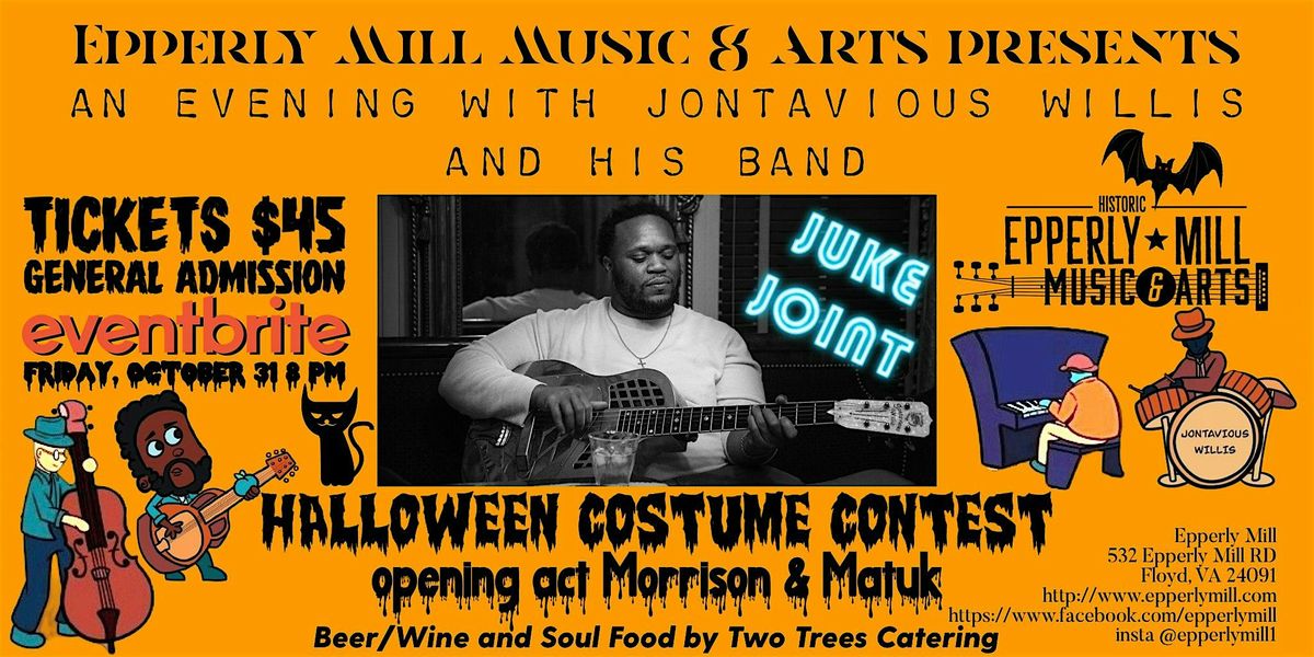 Epperly Mill Music & Arts presents a night of soulful upbeat blues with Jontavious Willis and his Juke Joint band! Get ready to groove on October 31, 2025 at 8:00 pm (Eastern Daylight Time). Let Jontavious and the band's infectious energy transport you to the heart of the south. This is a Halloween night event with costume contest (costume not necessary) Morrison and Matuk open the show with rockin acoustic music. Beer/Wine and great soul Food will be available!