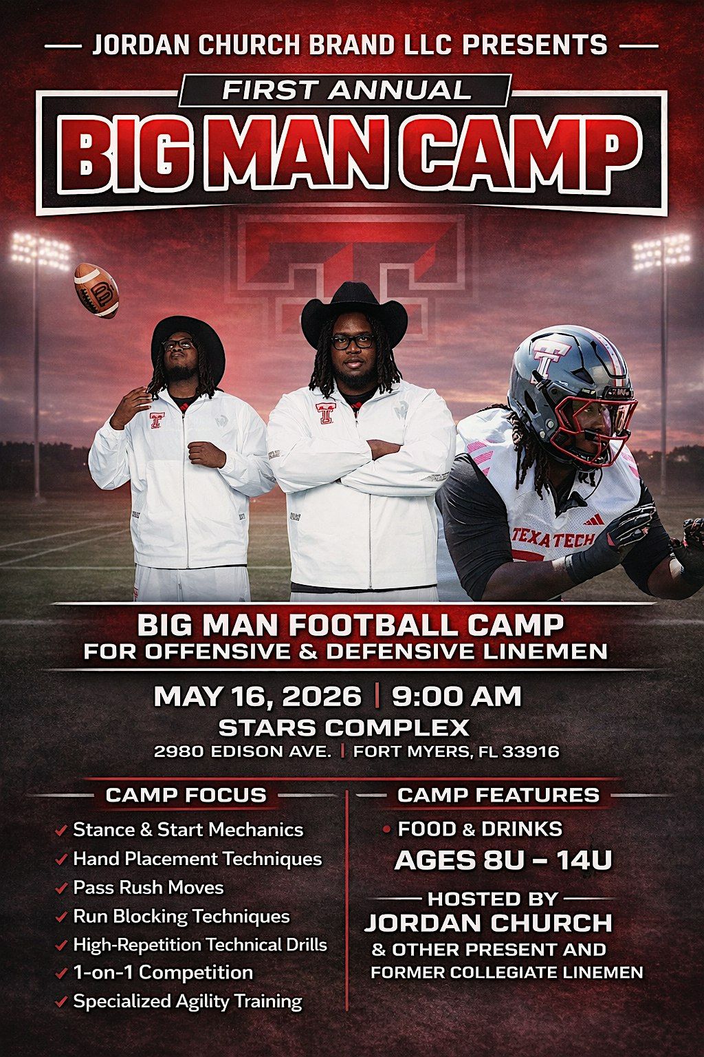 Led by Jordan Church and other current and former collegiate linemen, this camp focuses on developing proper technique through high-repetition drills, 1-on-1 competition, and specialized agility training. Athletes will work on stance and start mechanics, hand placement, pass rush moves, and run-blocking fundamentals, all in a competitive, high-energy environment.