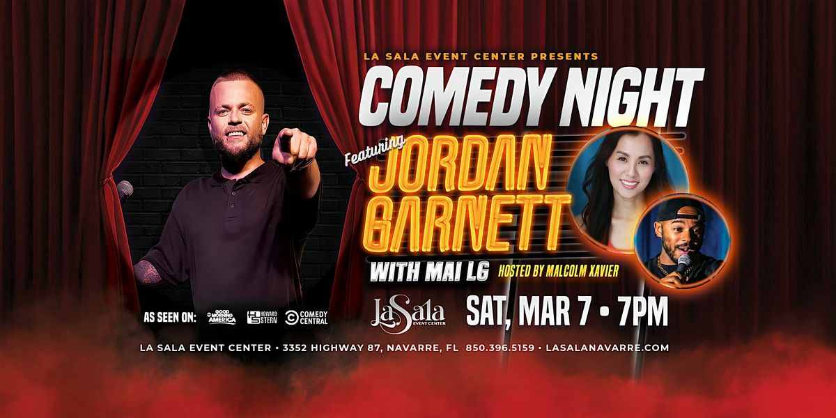Jordan Garnett live on March 7, 2026 at La Sala Event Center in Navarre, Florida — don’t miss this comedy show with feature comic, Mai LG, and host, Malcolm Xavier.