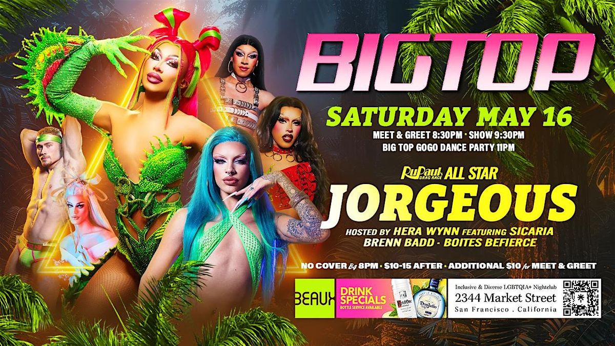 JORGEOUS fresh of of Rupaul's Drag Race All Stars is coming to turn the party darling at BIG TOP SATURDAY only at BEAUX IN THE CASTRO. Big Top is now monthly on Saturday nights to offer the best in nightclub entertainment.