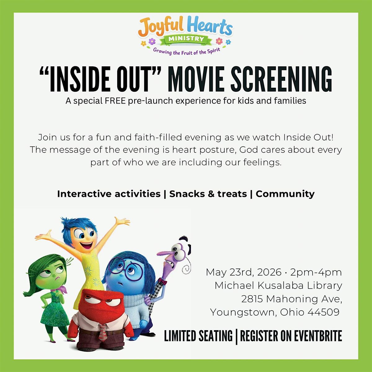 Join us for a fun and faith-filled evening as we watch Inside Out! The message of the evening is heart posture, God cares about every part of who we are including our feelings.