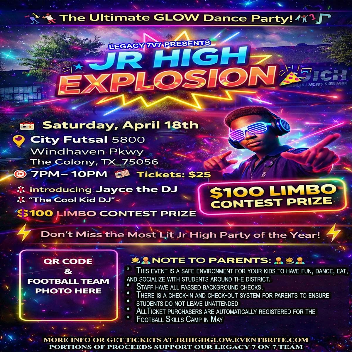 Get ready to glow up at the coolest in-person event of the season! The JR HIGH EXPLOSION - GLOW PARTY is where the fun, music, and lights come together for an unforgettable night. Wear your brightest neon and prepare to dance under the blacklights. Don’t miss out on all the laughs, games, and glowing vibes with your friends. This is the place to be if you wanna shine and have a blast!