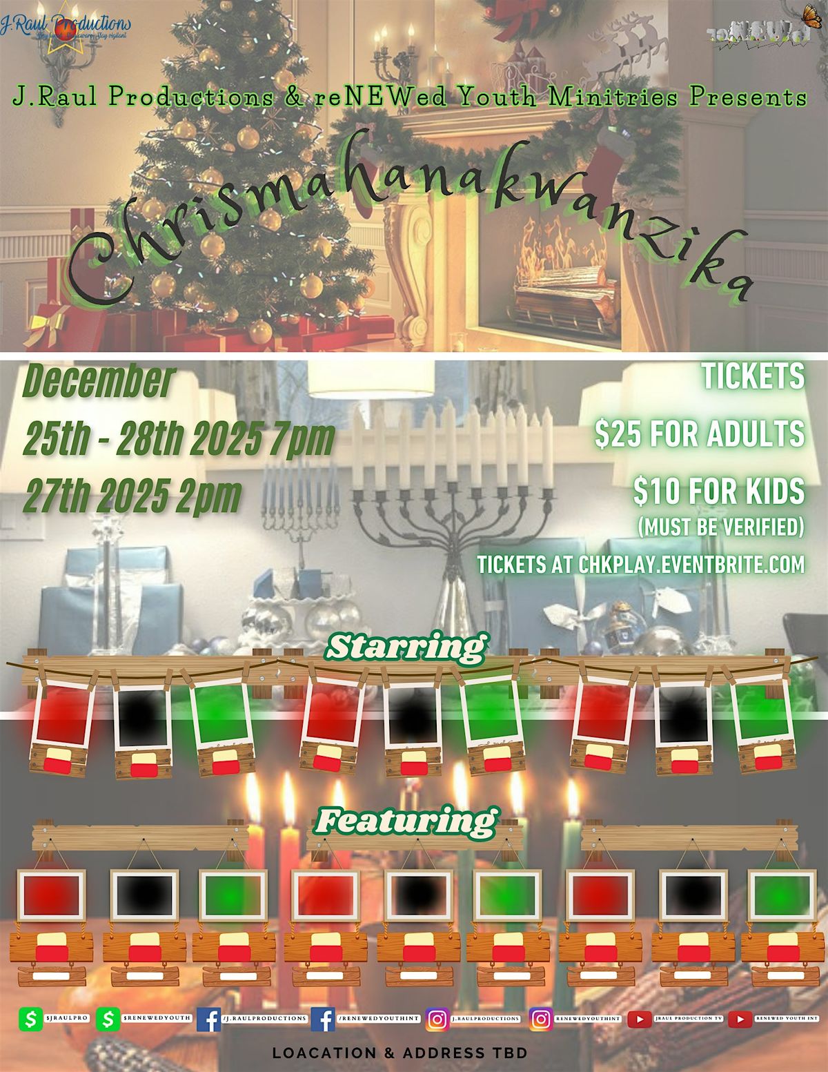 Come out and join J.Raul Productions and reNEWed Youth Ministires on December 25th-28th 2024 at 7pm and December 27th 2025 at 2pm for a fun time in God. Lift your hands, sing along, dance, praise, worship and an all around amazing time.