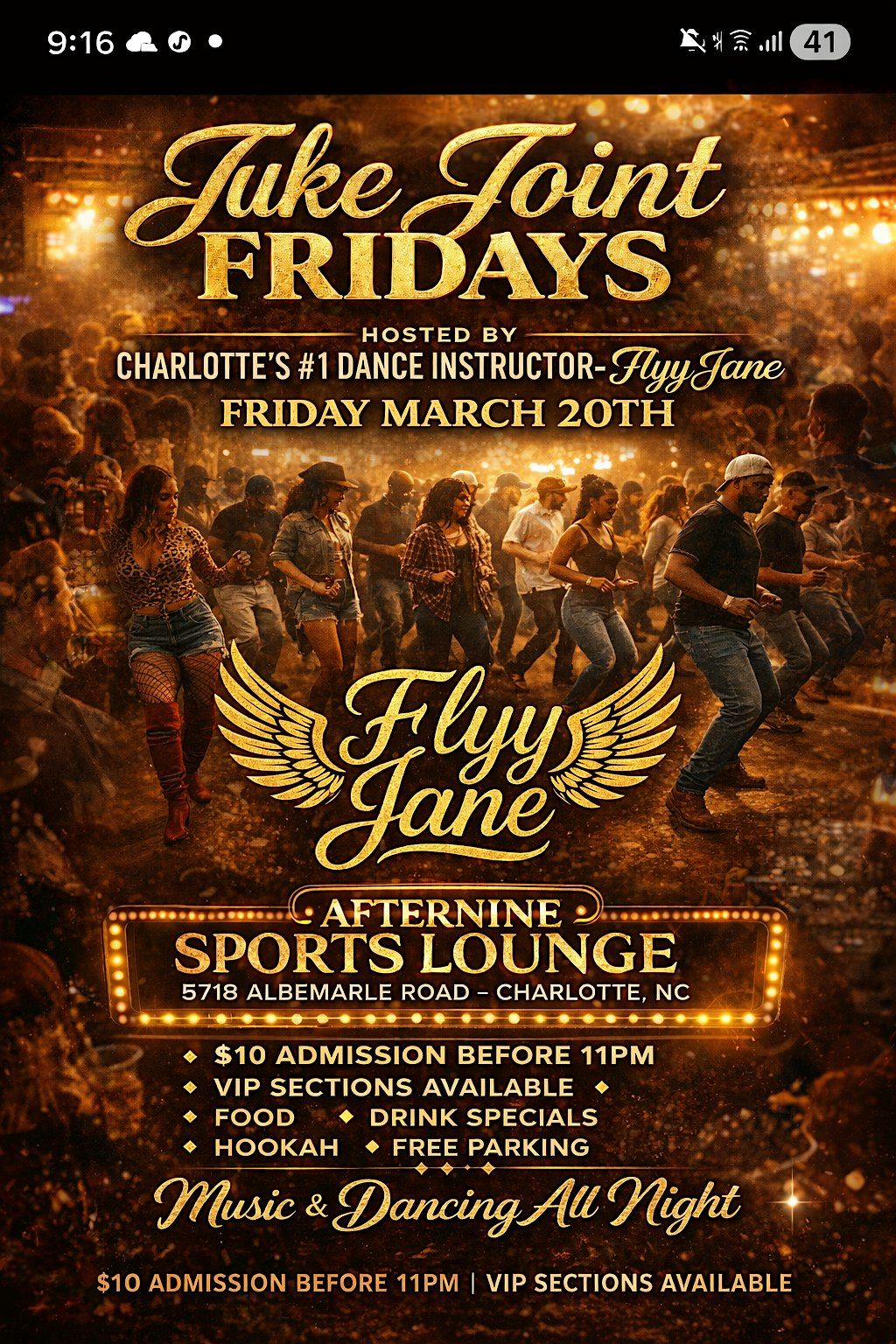 Join Charlotte’s #1 dance instructor Flyy Jane for a night of high-energy line dancing and great music at AfterNine Sports Lounge.
