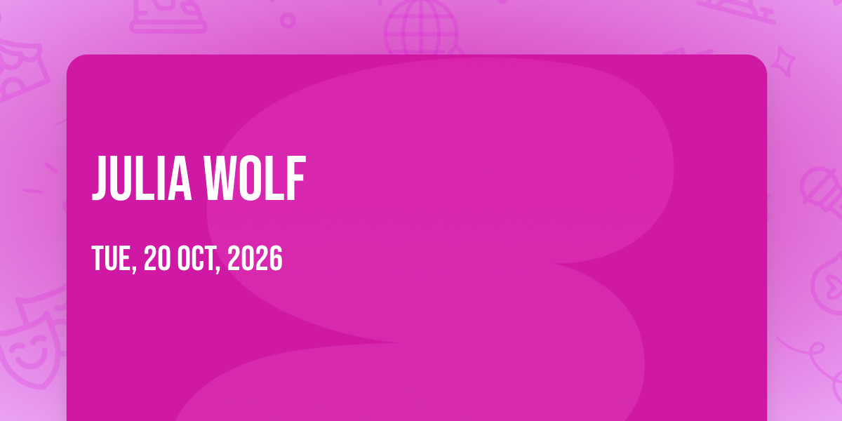 🎉 Welcome to Julia Wolf, where dreams come alive and possibilities are endless! 🏛️ Join us at The Showbox in the heart of Seattle, WA for an event that defies expectations. 📅 On October 20th, 2026 at 04:00 PM, be part of something truly extraordinary as we bring together innovation, entertainment, and pure magic. ✨ Every aspect has been carefully designed to ensure an unforgettable experience for all our guests. Whether you're seeking adventure, inspiration, or simply a break from the ordinary, this event promises to deliver beyond your wildest dreams. 🎊 Prepare for a journey into the extraordinary!http://maps.seatics.com/GeneralAdmissionEvent_2018-06-27_1649_SVGC_tn.gif