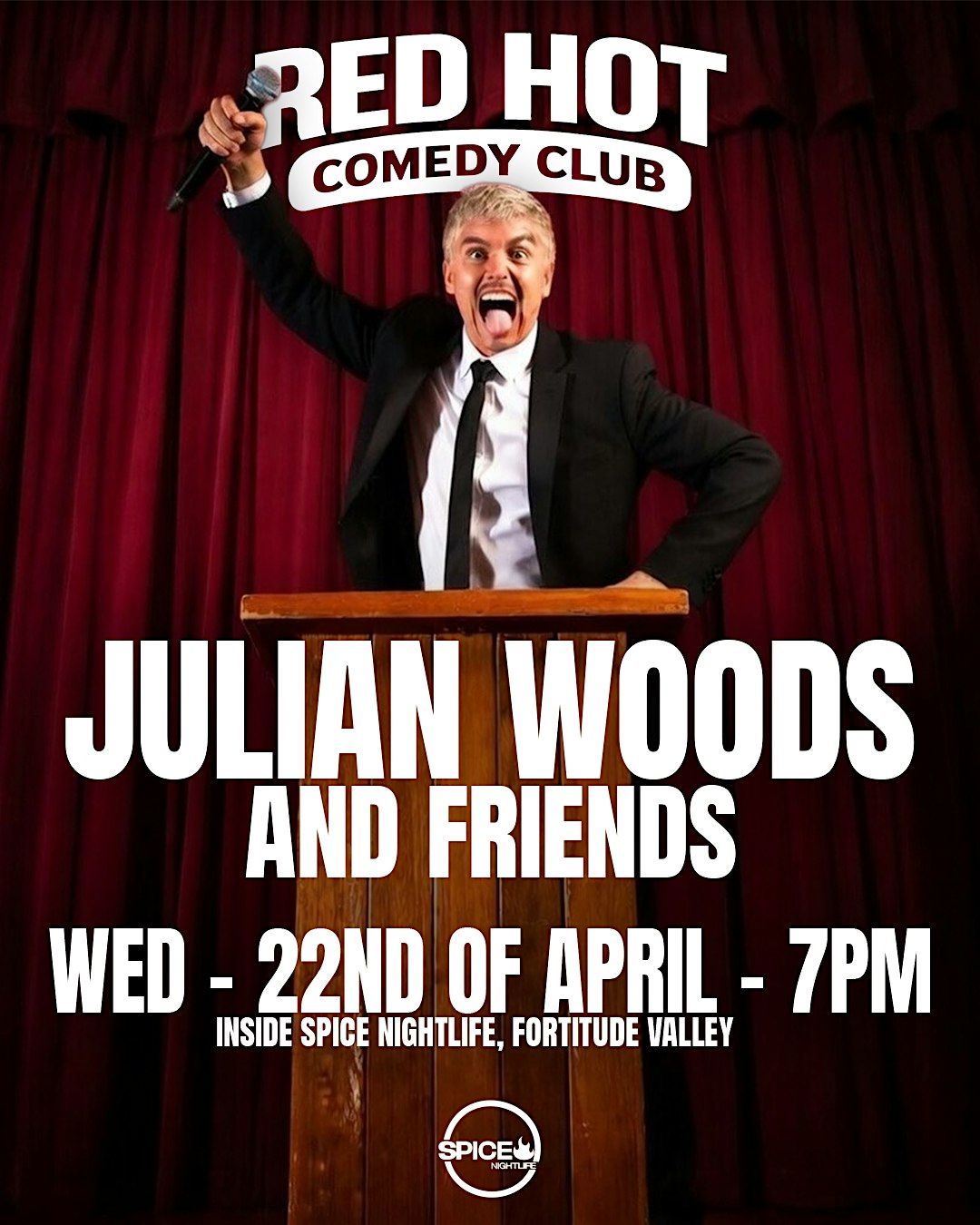 Opening night is headlined by Australia’s King of Dark Humour, Julian Woods — known for fearless material that walks the line (and then steps straight over it).