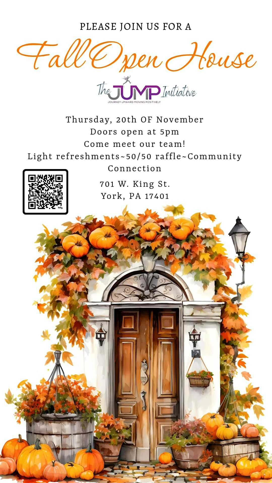 Welcome to the JUMP Initiative Fall Open House! Join us at the Recovery House of Worship for an evening with light refreshments, a 50/50 raffle, an opportunity to meet our team, informative sessions, and opportunities to connect with like-minded individuals. This event is the perfect chance to learn more about what we do and how you can get involved. Don't miss out on this exciting opportunity to be a part of something special. See you there!
