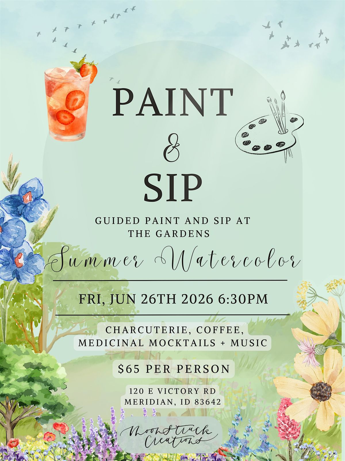 Watercolor Workshops and Paint and Sip events are perfect for family outings, getting together with friends, or a fun way to mix up date night! Moonstruck Creations events can be found all around the Treasure Valley in Boise, Meridian, Garden City, Nampa, Caldwell, Kuna, Eagle, Star, Middleton, Emmet, Avimor, Donnelley, and McCall. Moonstruck Creations events are a safe place to be creative and embrace our own unique expression.