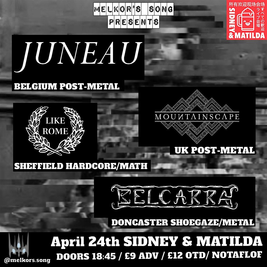 We are very excited to announce this absolutely STACKED co-headline show as we welcome to Sheffield for the first time Juneau with their crushing brand of Post-Metal from Belgium, the UK's own Mountainscape bring their filmscore inspired instrumental Post-Metal, with suport from Belcarra who return with their epic blend of Shoegaze and Metal and Sheffield's own Like Rome starting us off with some frantic and technical Hardcore. Expect heavy atmospheric build ups and devastating crescendos.