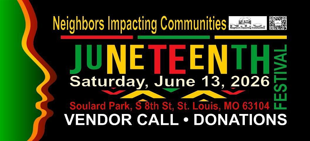 Join Neighbors Impacting Communities for their FOURTH annual Juneteenth Celebration in Soulard Park from 8 a.m. to 5 p.m. on Saturday, June 13, 2026, at Soulard Market Park in St. Louis, Mo. Free and Open to the Public. Lafayette will be closed between 7th and 9th Streets for the entire day.