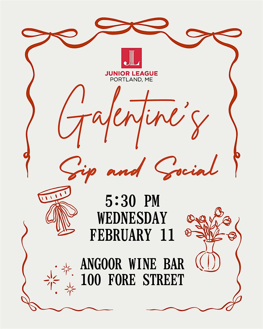 Join us the Junior League of Portland on Wednesday, February 11 at 5:30 PM at Angoor Wine Bar (100 Fore Street, Portland) for a relaxed evening of conversation, connection, and fun.