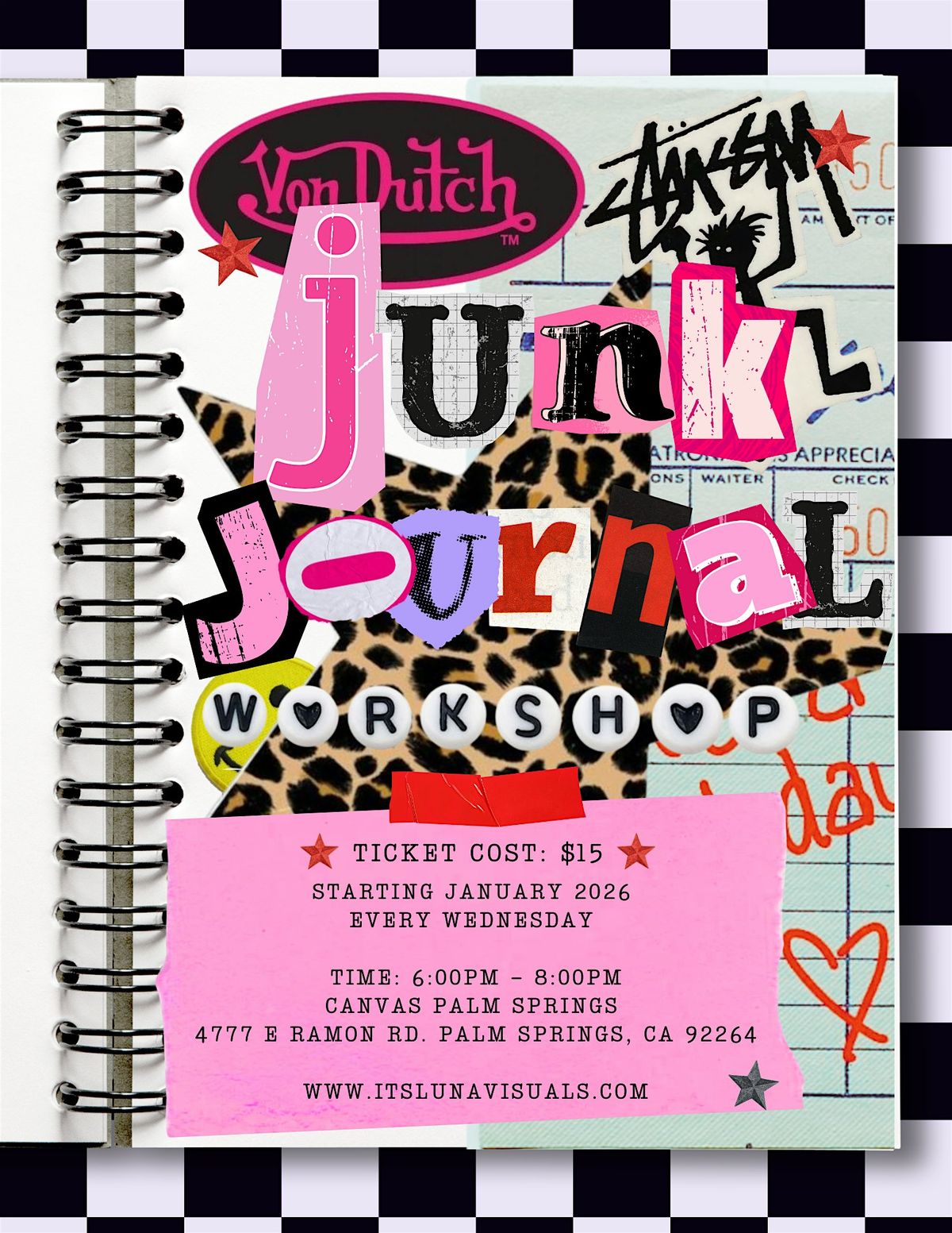 Join us every Wednesday for a cozy Junk Journal night at Canvas Palm Springs; a relaxed, open-studio creative space where scraps turn into stories and creativity flows freely.