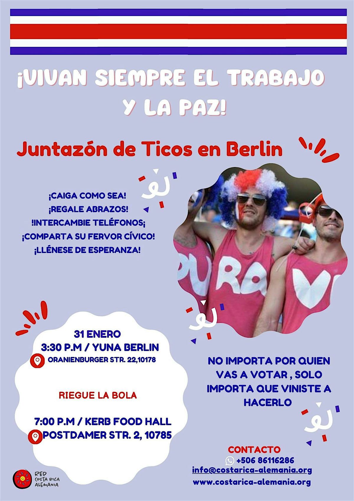 La Red Costa Rica Alemania e.V. se toma la linda atribución de crear un punto de encuentro previo a las elecciones, para que todos los ticos y ticas que llegan a Berlín —y los que ya viven aquí— puedan saludarse, abrazarse, llenarse de esperanza y vivir juntos la fiesta cívica antes del gran día de las votaciones