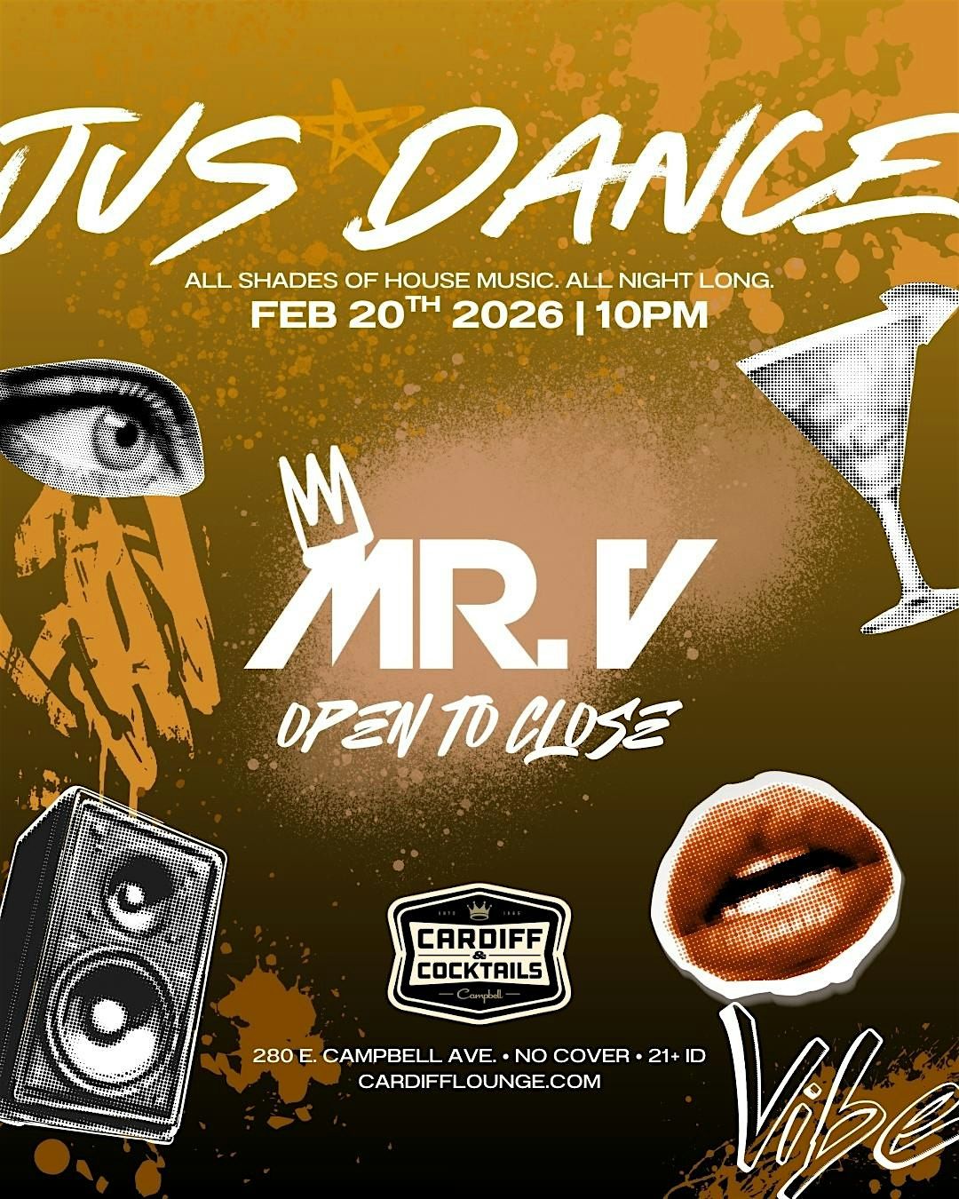 Sole Channel Events presents Jus Dance with DJ Mr. V & Friends Every Friday night, the dynamic and soulful sounds of House Music echo through the vibrant atmosphere of Cardiff & Cocktails, the hottest spot in Campbell, California.