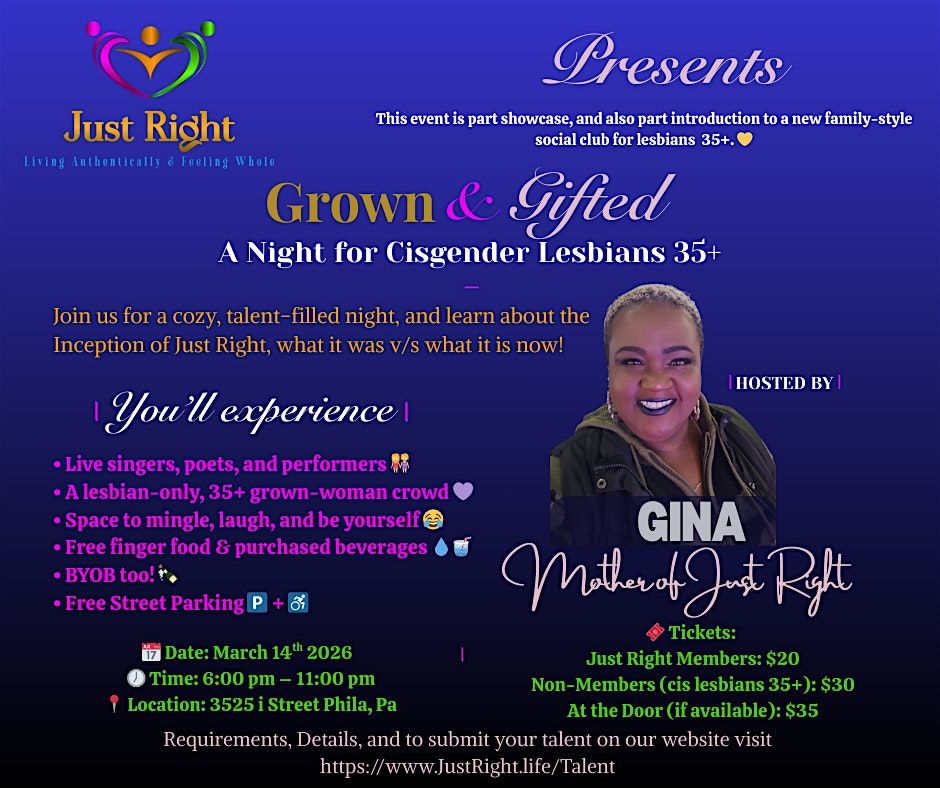 Ready for a grown, lesbian-only night out with talent, vibes, and future family?Grab your ticket, bring your good energy, and come see what Just Right is beginning to build. 💛