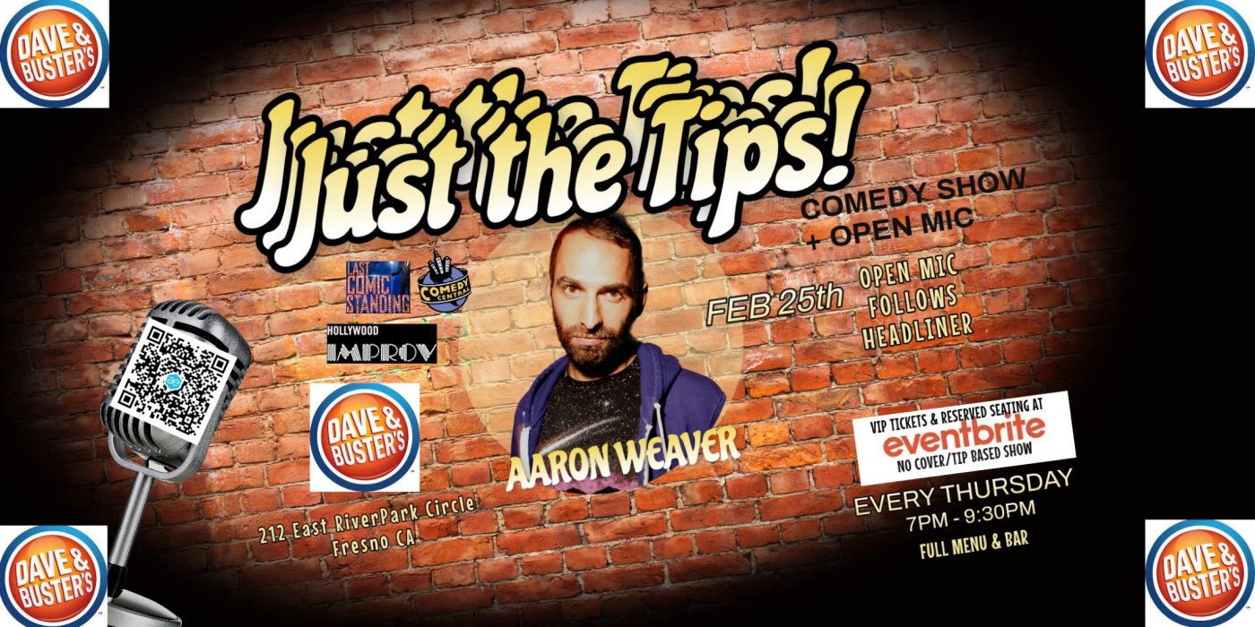 Join us at Dave & Buster's Fresno on February 25, 2026 at 7:00 PM for Just The Tips Headlining Aaron Weaver! Get ready for a night of laughter and fun with the hilarious Aaron Weaver. Don't miss out on this fantastic event!