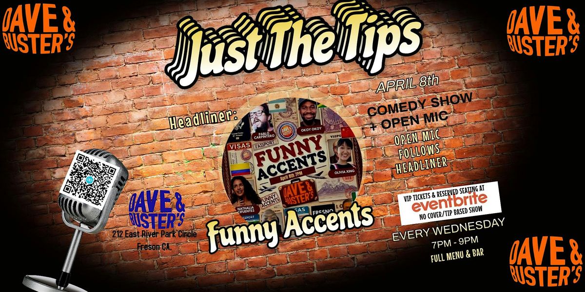 Get ready for a night full of laughs at Dave & Buster's Fresno! Join us on April 15, 2026 at 7:00 PM (Pacific Time) for an awesome comedy show featuring hilarious accents and a fun open-mic session. Whether you're a comedy fan or just looking for a good time, this event will have you cracking up all night long. Don’t miss out on the fun and great vibes!