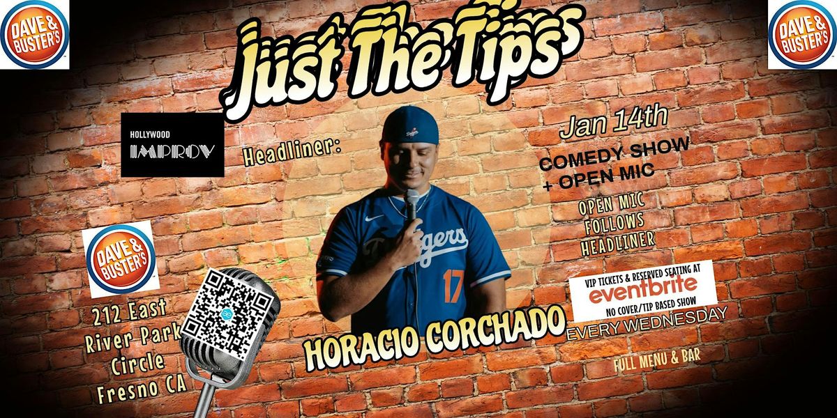 Welcome to the Just The Tips Comedy Show featuring local headliner Horacio Corchado! Get ready for a night full of laughs at Dave & Buster's Fresno. Join us on January 14, 2026 at 7:00 PM (Pacific Time) for a hilarious evening. Don't miss out on this opportunity to enjoy great comedy in a fun environment. See you there!