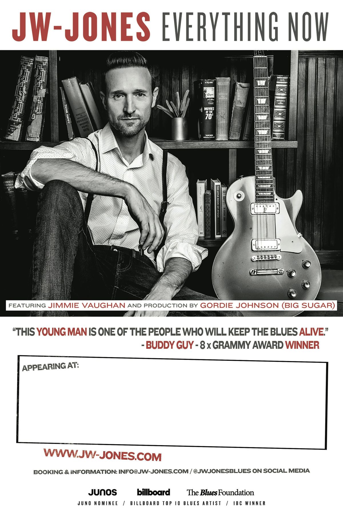 After winning “Best Guitarist” at the 2020 International Blues Challenge in Memphis, Jones started working on his 12th release ‘Everything Now’, an all-original project with special guest Jimmie Vaughan, and production by Gordie Johnson (Big Sugar)